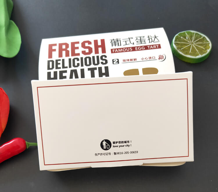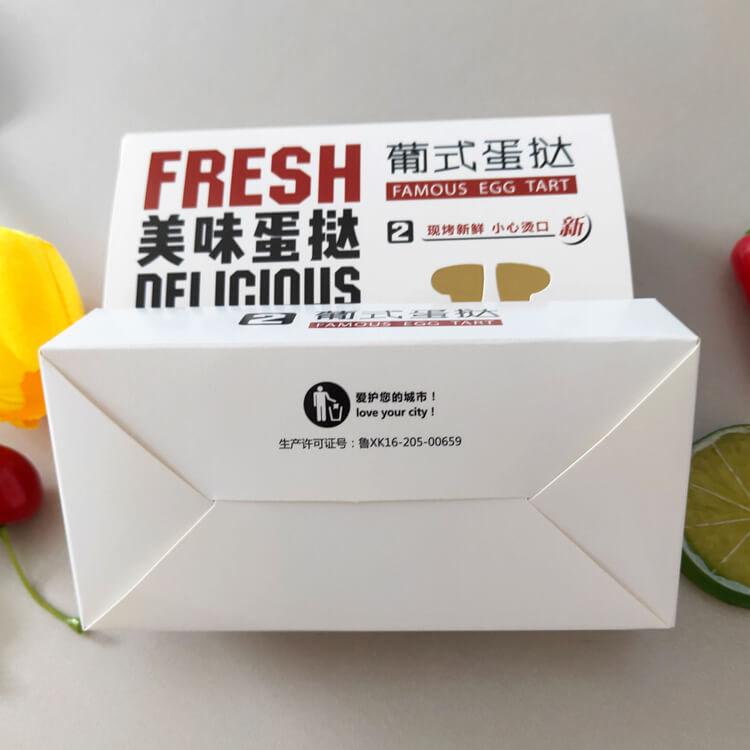 1. 選擇高質量的材料:蛋撻盒使用的紙板要選擇質量好、強度高的材料,能夠承受住蛋撻的重量和壓力,不容易變形。